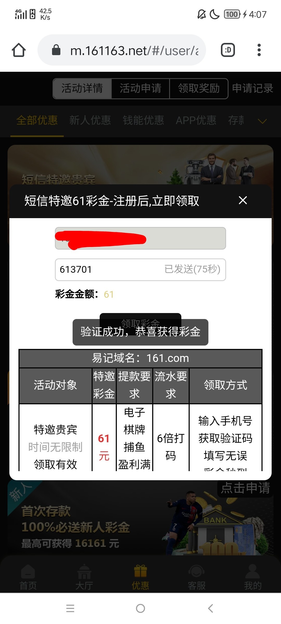 新用户注册绑卡,完善信息再下载APP。然后编辑短信发送账号申请61彩金,满610即可提现,详细看优惠活动,具体自测!